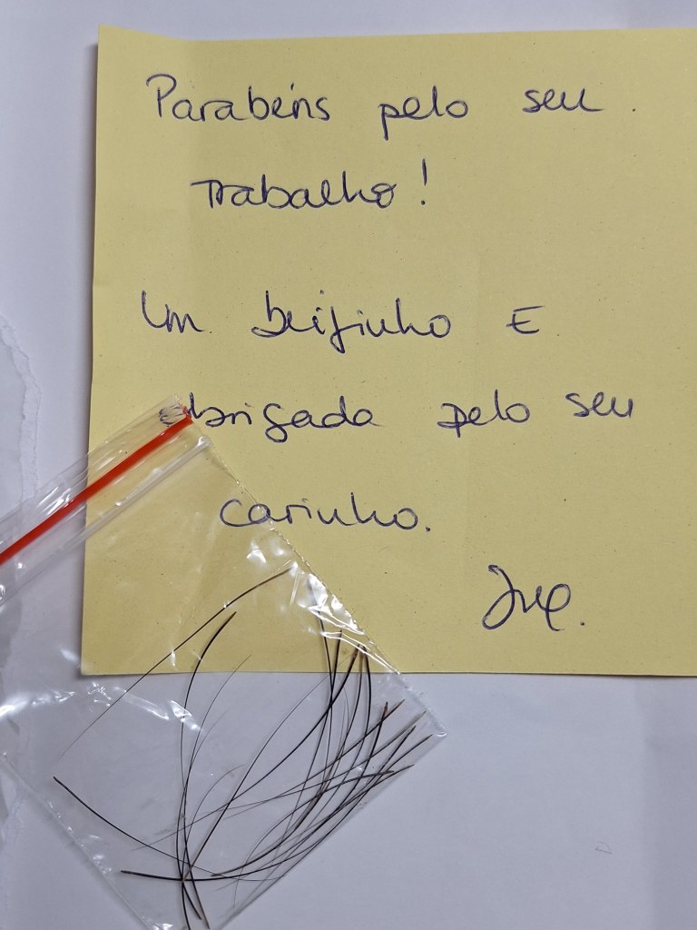 A dona da Freyja pediu-me que incluísse alguns dos seus próprios bigodes, que ia encontrando e guardando com tanto carinho. Fiquei genuinamente emocionada com o pedido. É incrível como um gesto tão pequeno pode ter um significado tão grande.