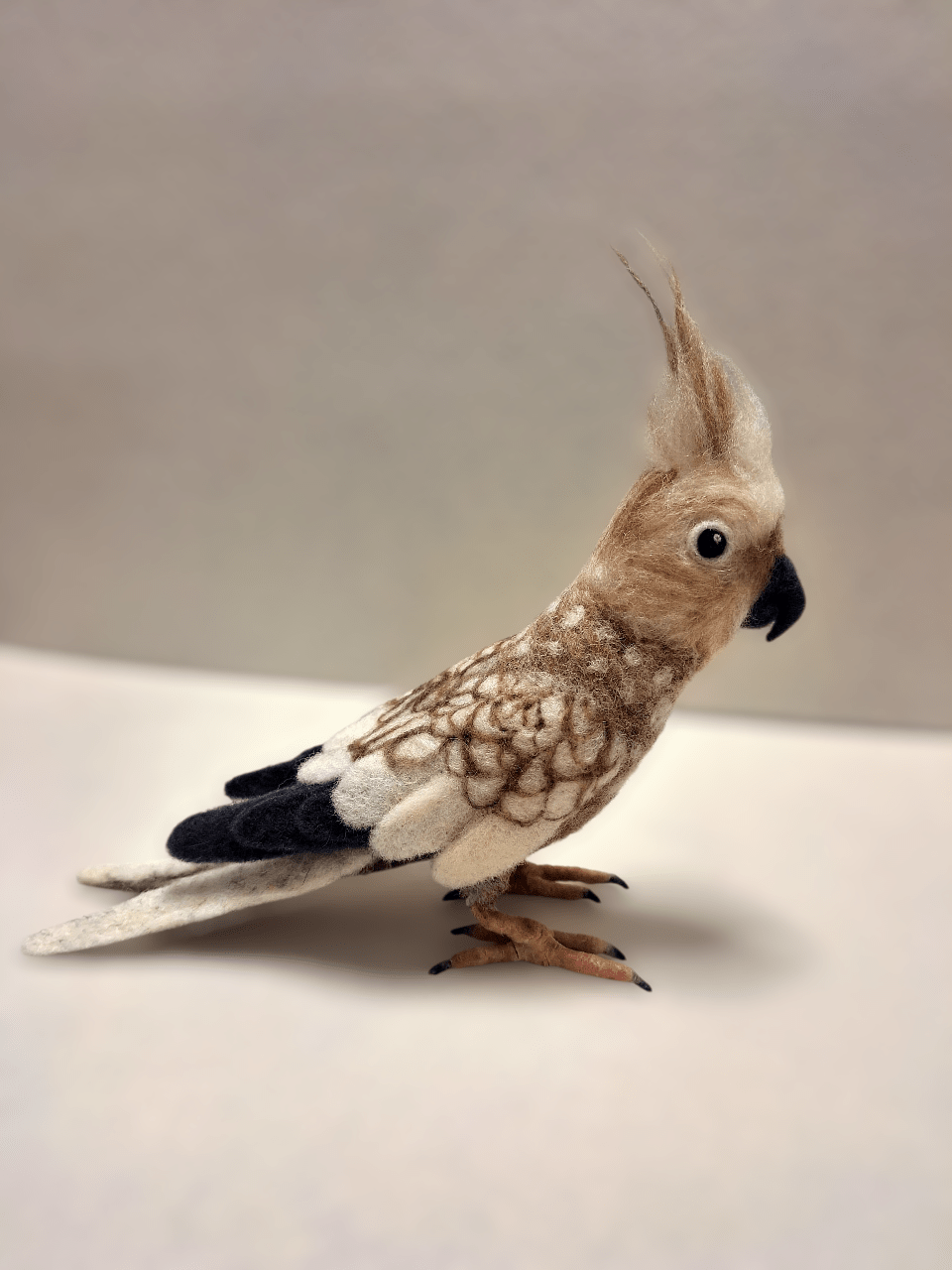 Recriar aves em lã é sempre um desafio especial. As penas, as transições de cor e a delicadeza da forma exigem tempo, observação e muita paciência.